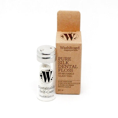 Dental floss in a refillable glass vial. 30m of 100% silk, biodegradable dental floss. Zero Waste floss that can be disposed of in your compost pile. Refill sold separately.